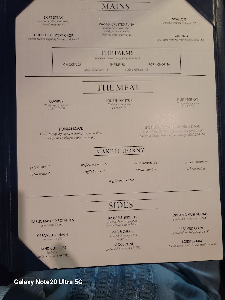 50 oz, 45 day dry aged, roasted garlic broccolini, rock potatoes, vinegar peppers