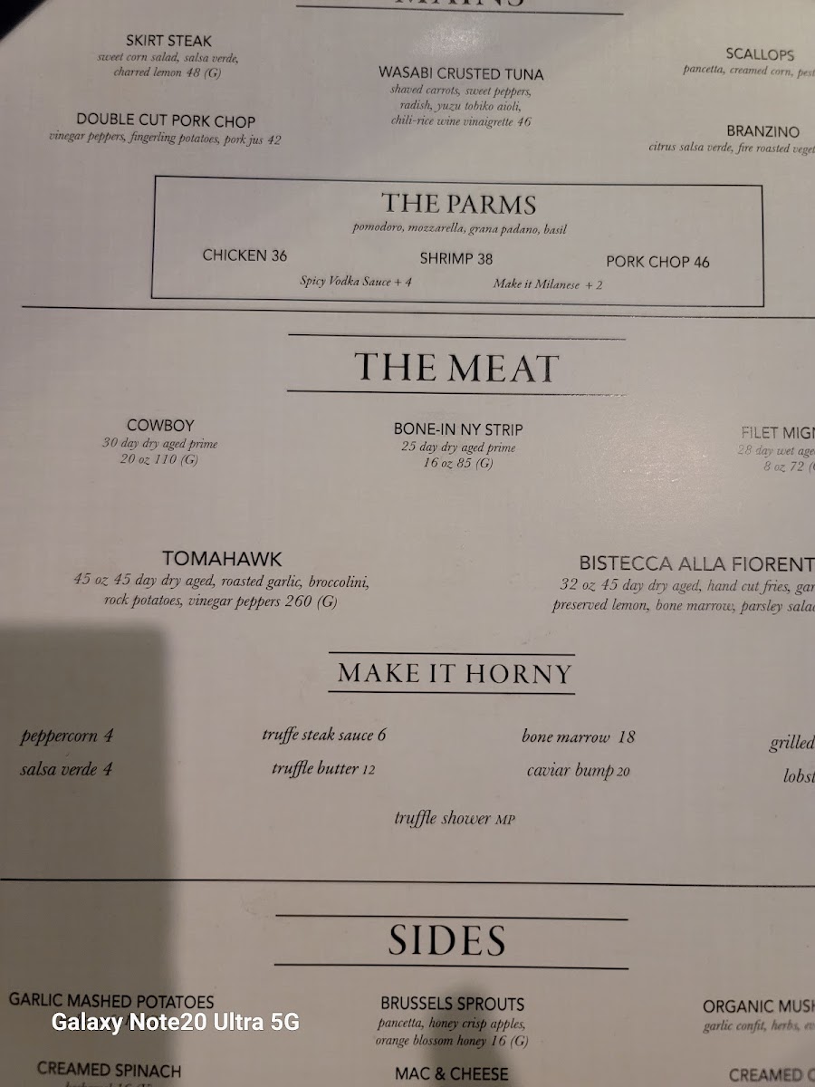 40oz 45 day dry aged, steak fries, garlic confit, preserved lemon, bone marrow, parsley salad